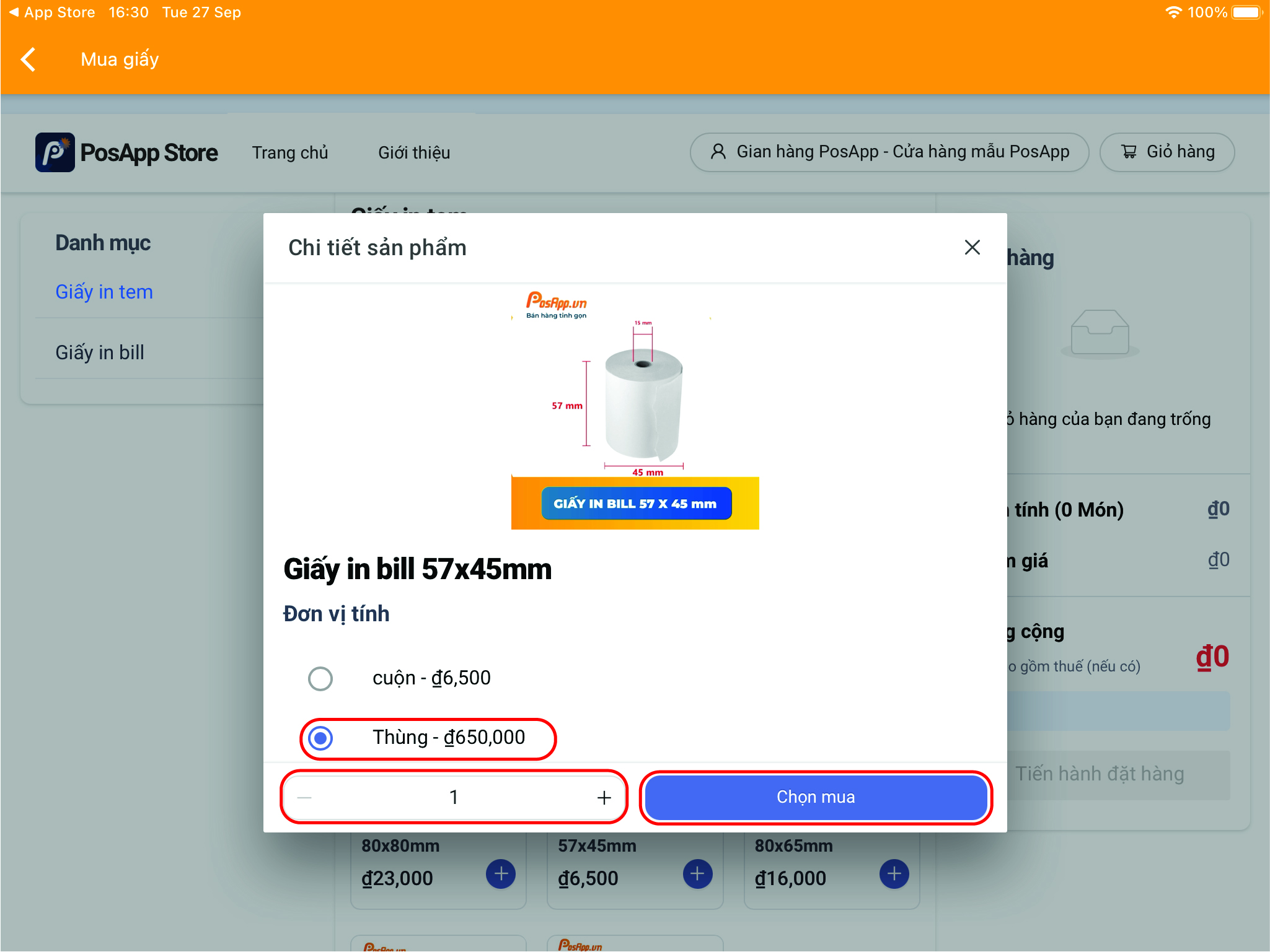 **Bước 2:** Lựa chọn giấy muốn mua, chọn loại cuộn/thùng và số lượng => Bấm Chọn mua