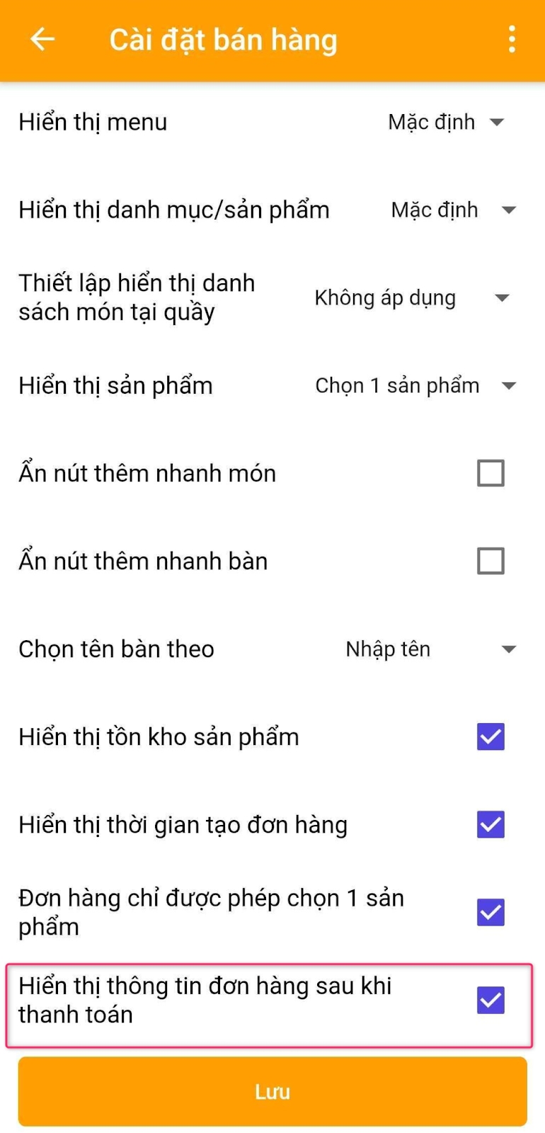 Cửa hàng tick chọn cờ 'Hiển thị thông tin đơn hàng sau khi thanh toán'